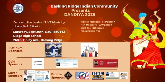 Basking Ridge Indian Community presents - Dandiya 2024!  LIVE band, food for purchase, vendor stalls, and more!  Become a member to avail of the member ticket pricing.